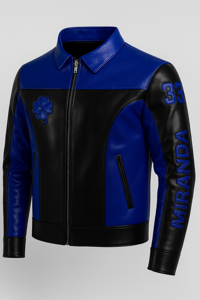 • “MIRANDA” logo leather embossed vertically on the left sleeve (beneath the 33) in electric blue